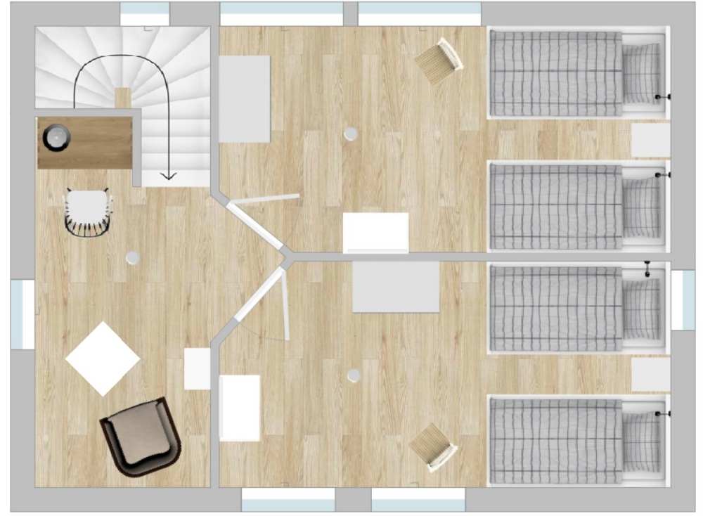 Es befindet sich in dem Haus ein kombiniertes Wohn- und Esszimmer, zwei Schlafzimmer, eine Küche, ein großes Bad und zusätzlich