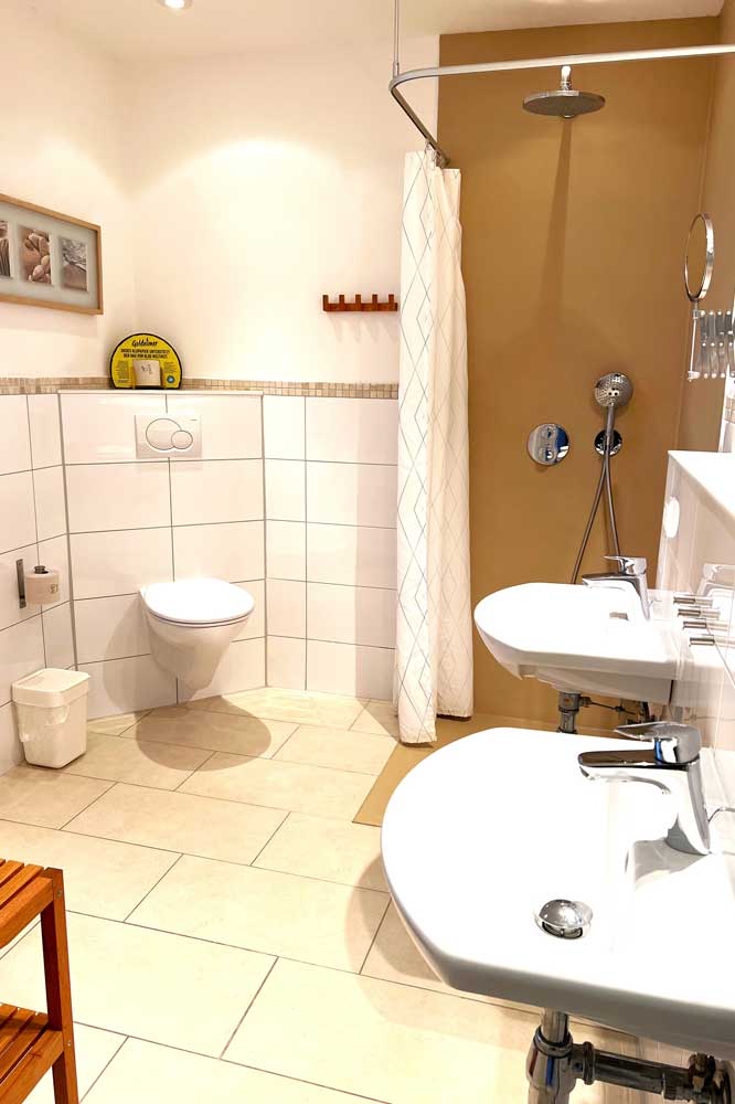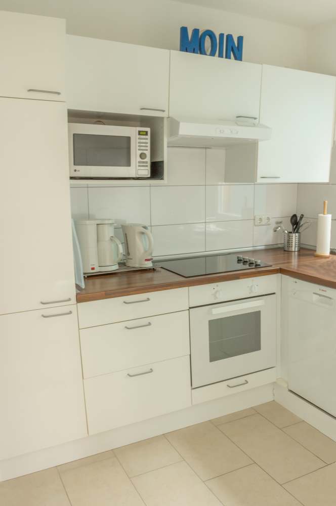 ein separates WC. Das modernisierte Bad besitzt zwei Waschbecken, eine Dusche und einen Haarfön. Die Küche bietet nahezu eine Vollausstattung, welche u.a. aus einer Mikrowelle, einem Herd mit Backofen, einem großen