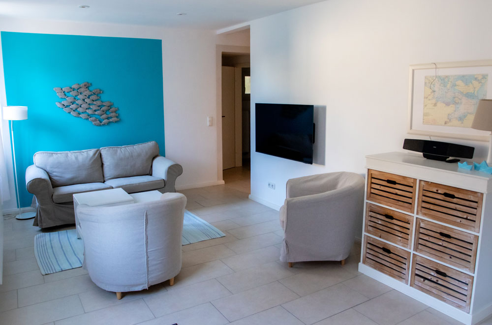 Im Essbereich finden Sie einen Esstisch vor, der Platz für 6 Personen bietet. Der Wohnbereich ist mit einem Sofa, zwei Sesseln und einem 50 Zoll Smart TV, sowie einer HIFI Anlage ausgestattet. W-Lan steht für sie kostenlos zur Verfügung.
